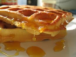 Waffles and maple syrup – Waffle é como uma panqueca mais grossa que não é frita. Maple syrup é um xarope doce, extraído da árvore com o mesmo nome.
